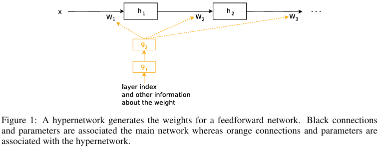 본 연구에서는 작은 네트워크(하이퍼네트워크라고 불림)를 사용하여 더 큰 네트워크(주 네트워크라고 불림)의 가중치를 생성하는 방식을 고려합니다. 주 네트워크의 동작은 일반적인 신경망과 동일합니다: 원시 입력을 원하는 목표로 매핑하도록 학습합니다. 반면 하이퍼네트워크는 가중치 구조에 대한 정보를 포함하는 입력 세트를 받아서 해당 계층의 가중치를 생성합니다(그림 1 참조).
